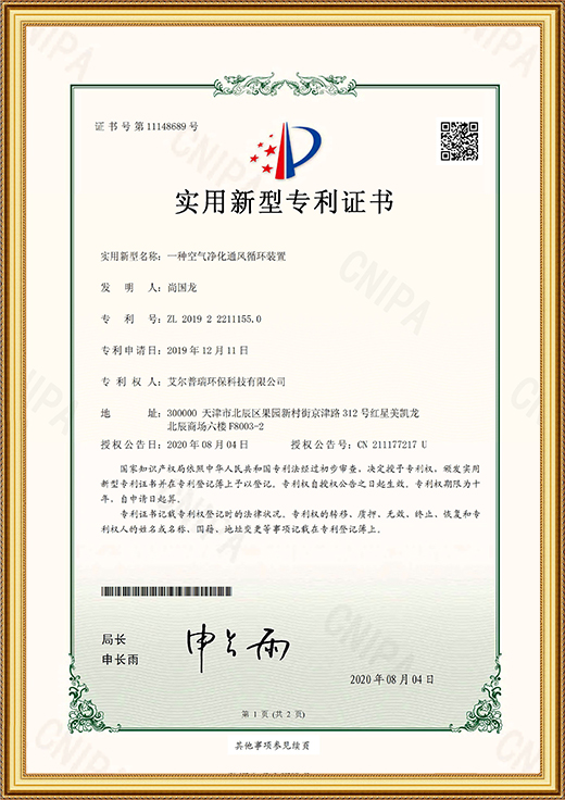 實(shí)用新型專利證書(一種空氣凈化通風(fēng)循環(huán)裝置